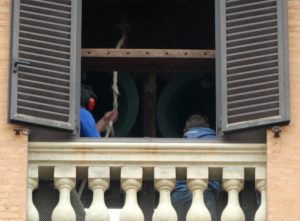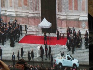 The crowd erupted with cheering and applause; people and flags waved from the balconies of buildings around the Piazza; television cameras streamed vision live to the big screen; and overhead a small drone kept a wary and constant eye on us all. (No, I won’t draw the analogy … you can do that for yourselves).