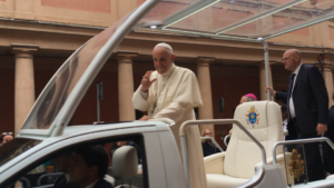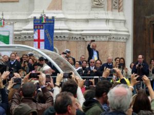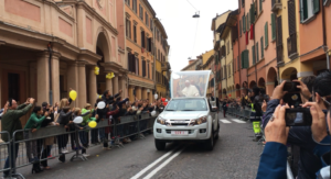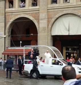The first stop on the Papal itinerary that morning was a visit to Bologna’s Migrant Reception Centre and the Pontiff took time to meet many of the migrants individually; so it was about fifteen minutes past the appointed hour when the Popemobile finally came into view. Papa Francesco had arrived.