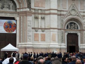 Stepping forward to the microphone Pope Francis wished everyone a “Happy Sunday!” before going on to deliver his address on ‘the world of labour’. “Seeking a more just society,” he said, “is not a dream of the past but a commitment, a work, that today needs (the cooperation of) everyone.” Then with a smile, a wave and a request to ‘not forget’ him, the Pope left to have lunch with the poor in the Basilica … but not before a couple of dozen of Bologna’s other important people had their chance to meet the Pontiff.